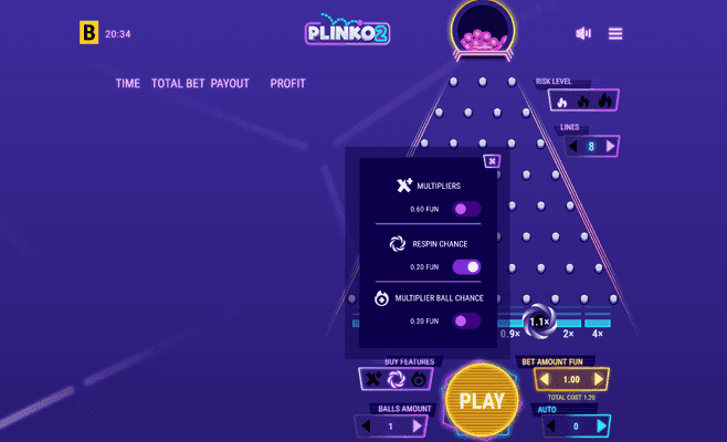 Bonus-Käufe – einige Plinko-Varianten bieten kostenpflichtige Funktionen, zum Beispiel bietet Plinko 2 von BGaming drei Funktionskauf-Optionen: Multiplier (ermöglicht bei Treffen des richtigen Stifts, Ihren Ball vor dem Erreichen des Slots zu verdoppeln), Respin-Funktion (schafft die Möglichkeit eines kostenlosen Ball-Wurfs beim Landen im Bonus-Gewinn-Slot) und Multiplier Ball Chance (der Ball hat bereits einen Multiplikator von 1x-10x, und beim Landen im Gewinn-Slot wird die Summe addiert).