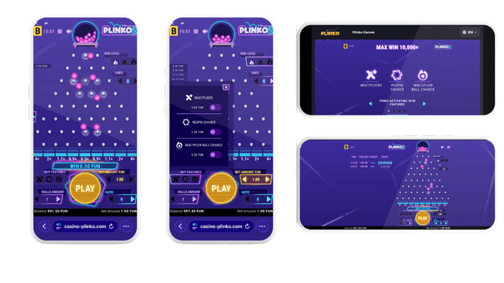 - ✦Plinko 2 features unique bonus mechanics – movable multipliers, respin portals, multiplier balls (x2/x4) – absent in the original Plinko and most competitors