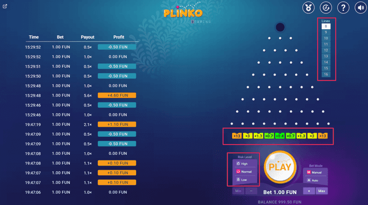 Select how many lines (8-16) you want on your board. More lines create more bounce possibilities as the ball travels down the pins. Remember that 16 lines combined with high risk gives access to the maximum 1000x multiplier.